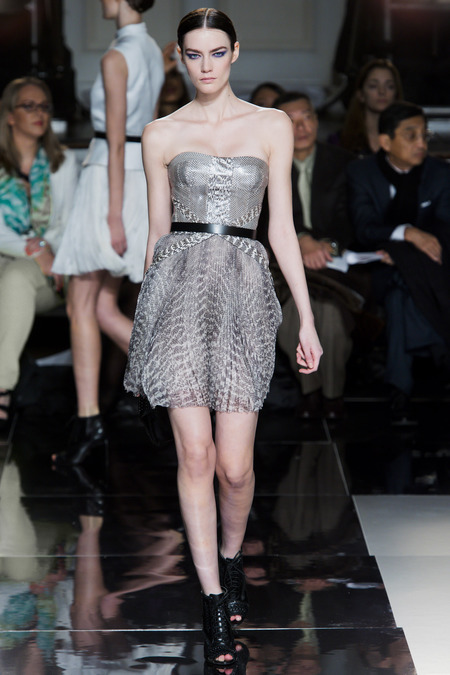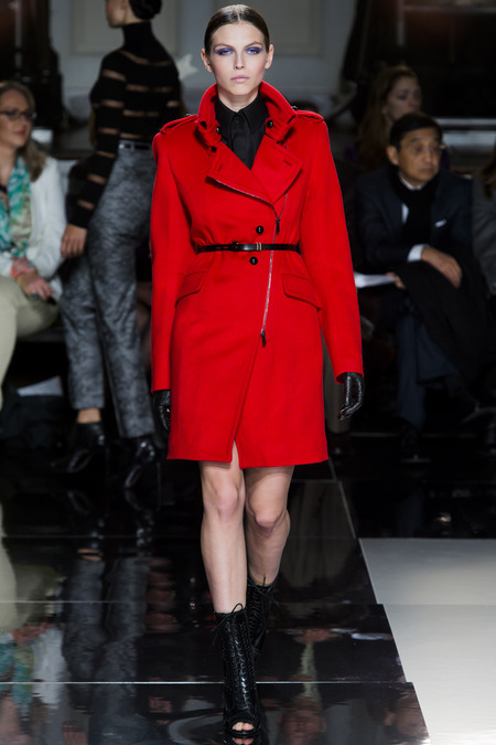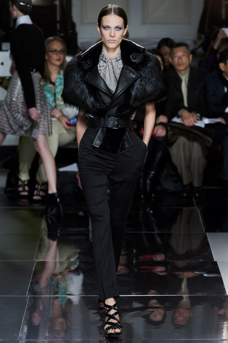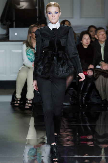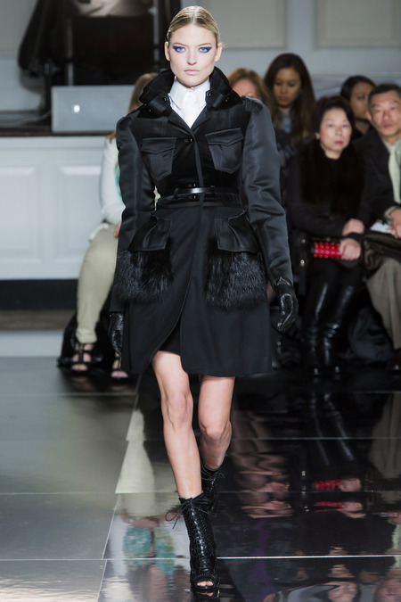 Jason Wu is one amazing designer who dresses our first lady, Mrs. Michelle Obama.  Season after season Wu takes the us on a new fashion adventure.  This season he pulled in the top models: Jessica Stam, Catherine McNeil, Hilary Rhoda, Bette Franke, Chanel Iman, and surprising an absence from Karlie Kloss.  This season’s opening look featured a black evening coat with fur detailed pockets with two military style pockets near the labels. With Wu there is always mix of high and low with an elegance.  The runway show were black leather laced up stilettos with braiding on each side of the boot.  Not to mention the open toe makes a more urban look.