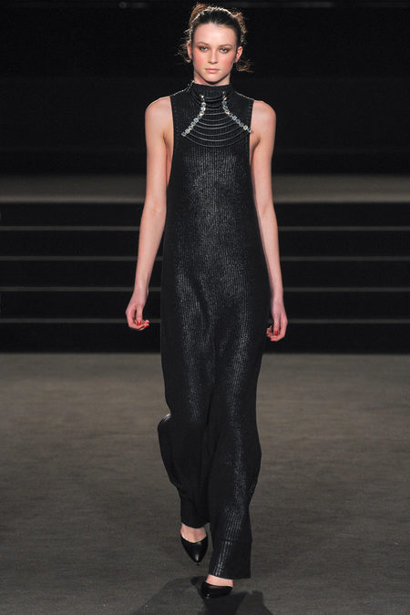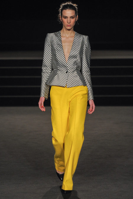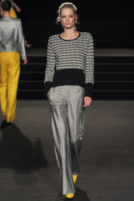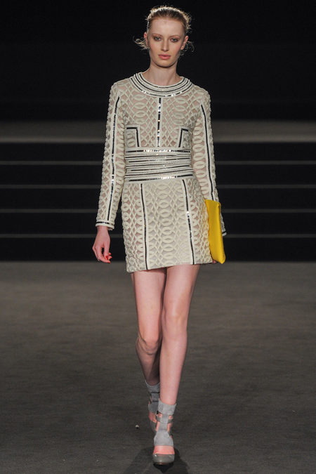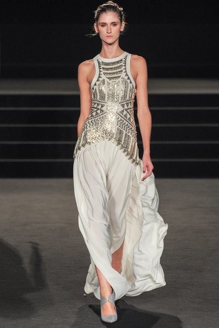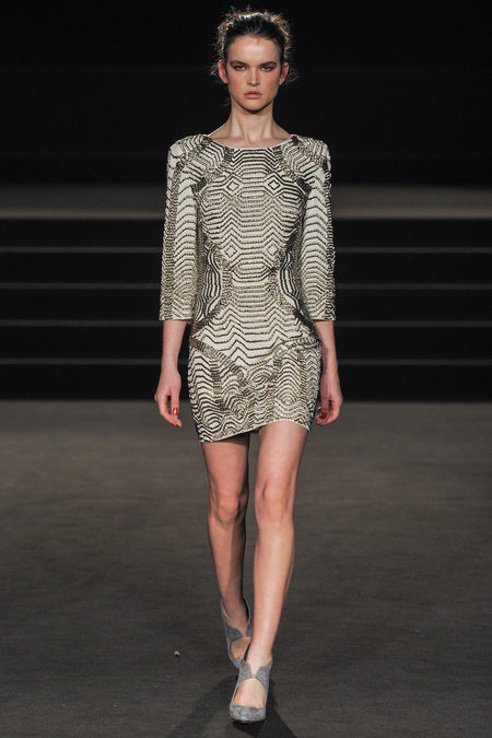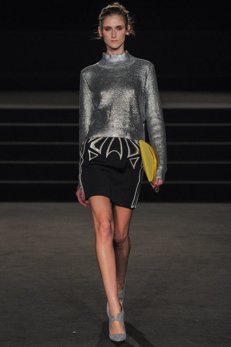The Fall 2013 Collection was entitled Wintergate. There were classic black and metallic silver piece with shots of bold yellow. The opening look was a metallic chevron patterned blazer with a pair of wide leg yellow trousers was such a strong choice. Other looks included dresses of various length adding some needed glamour along with corsets and strapless tops with skirts. The shoes designed were a pointed yellow patent leather heels and other architectural grey shoes. My favorite look was the 8th look which was a floor length metallic silver dress that looked like Sass & Bide poured liquid silver onto the model’s body. Such a red carpet look any person would be named “Best Dressed” in.