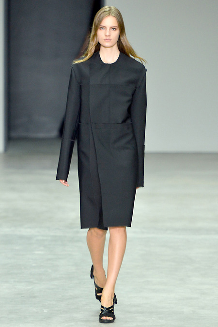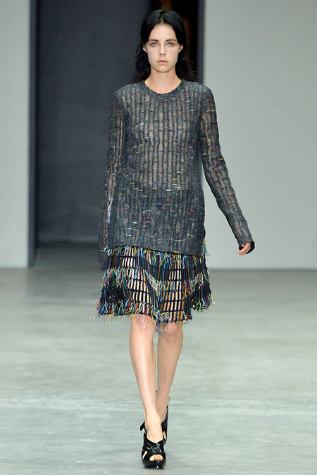 There was a lot of layering of fabrics. One including cotton tweeds. Tweed is not necessary a fabric you would associate with the Calvin Klein aesthetic, rather the fabric most popular by Chanel. One look that made me think of the Parisian label was a black coat with a multi-colored threads coming out of the coat. It looks like a looked like a new interpretation of a minimalistic techno-colored dream coat. Threading and fringe was also seen on many of the different looks. There were also multi-paneled dresses, coats, and sweaters that gave a see-through effect on some pieces.