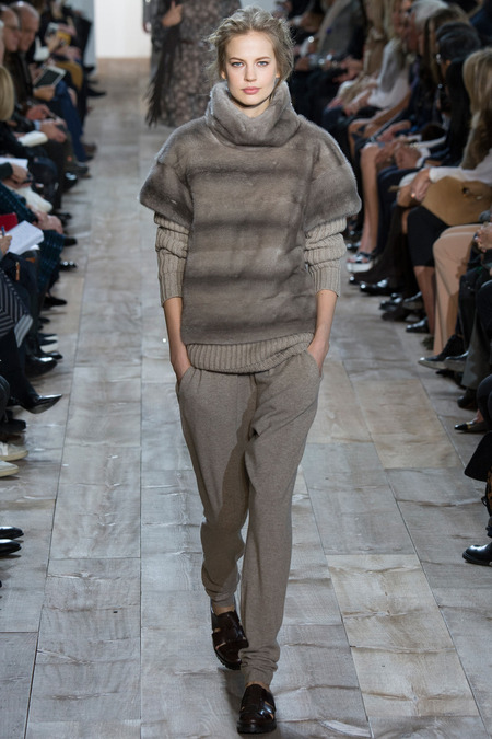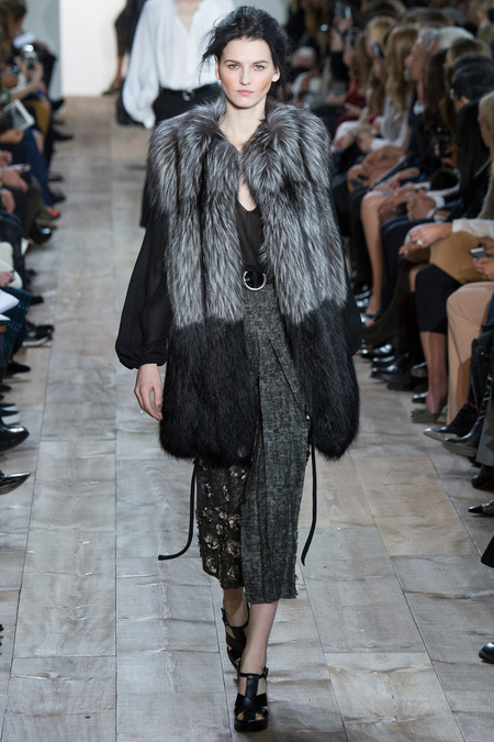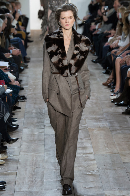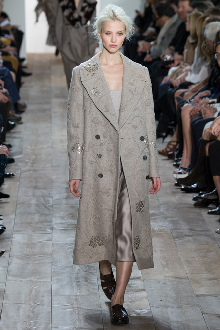 The collection featured Kors’ love of mixing high and low-end fabrics together including cashmere and fur with leather belts and tons of suede fringe. He is a master of creating items that every man, woman, and child would want in their wardrobes. Some of his day pieces included suits, pants, skirts, sweaters, tops and overcoats. One of my favorites a camel floor length coat with a simple and glamorous silvery-gray slipdress.