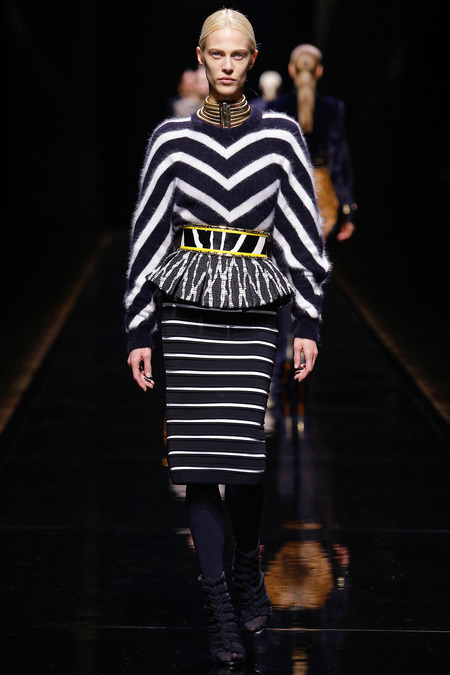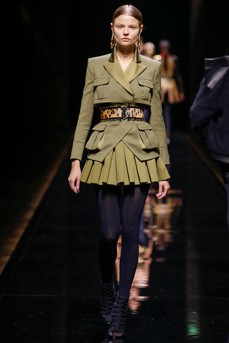 Olivier Routsteing, Creative Director of Balmain, created a new Balmain woman for Fall/Winter 2014. The glamour and glitz of the previous season was suddenly gone and replaced with layers of chic safari jackets, high waisted skirts, cargo jackets and pants. Prints were bold and featured leopard spots and zebra stripes. The color palette was olive, black, brown, gray, and touches of red. Not to mention accessories included silk cord and gold chain belts in black, grey and other hues and tribal beaded jewelry.