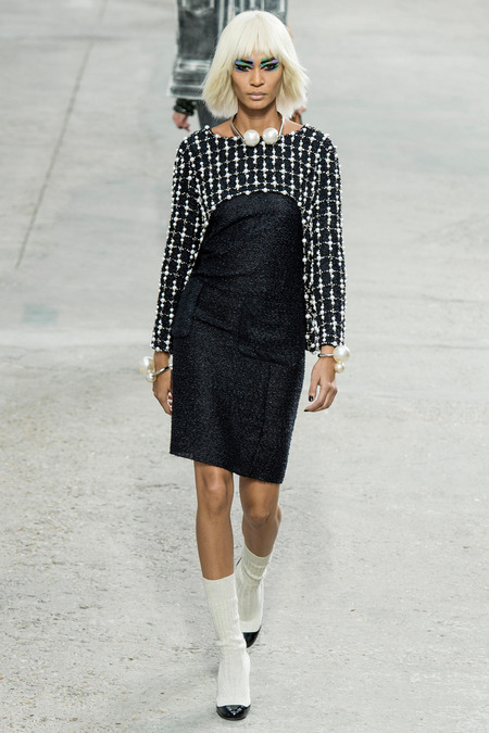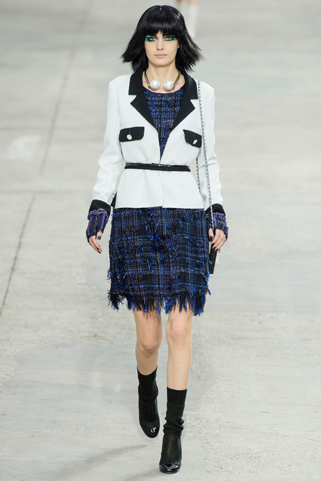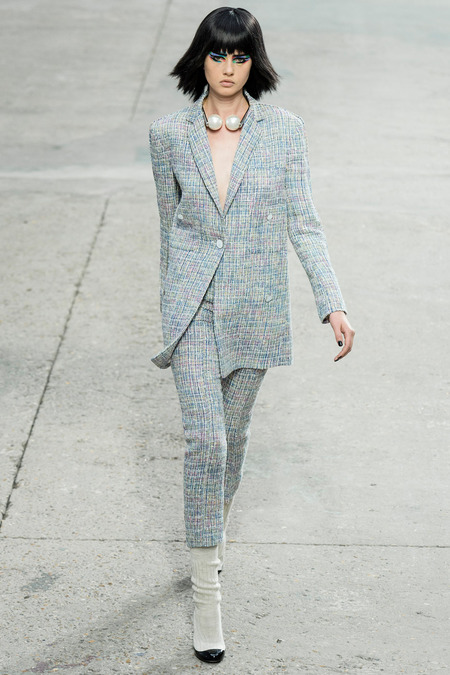 The classic Chanel tweed was reworked into different jackets, dresses, and suits in various colors and patterns. Bags were featured in all sizes but one of my favorite bags was a small clutch looked like it was made from Legos in neon colors. A few of the tweed skirt suits were in pink & white, pink & black, and navy & black plaid tartans offering a punk edge. Two looks were pairs with white tweed jackets. But again the last few seasons, Lagerfeld has created strong and powerful woman that evokes the spirit Coco Chanel herself.