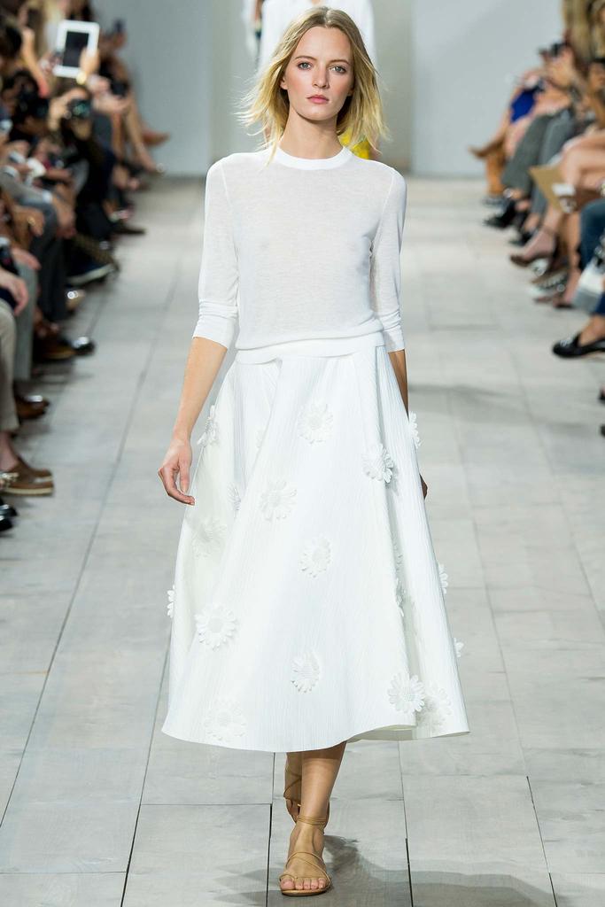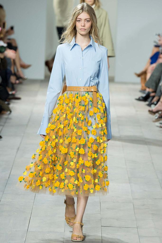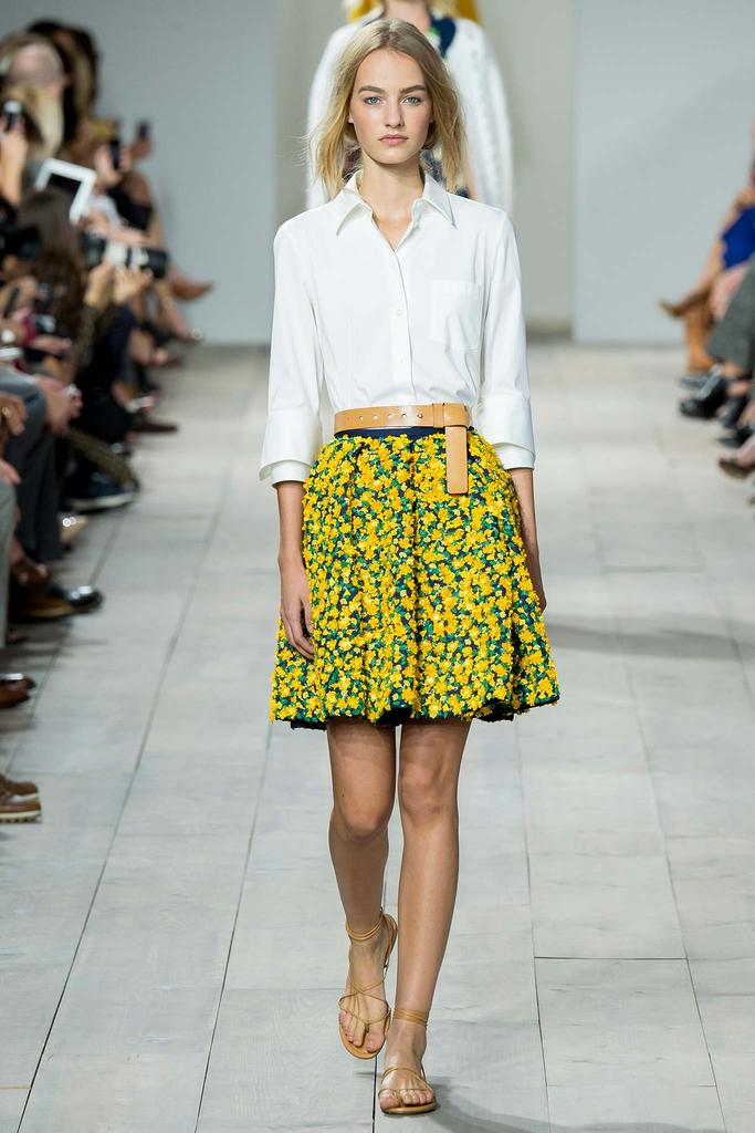 The Spring 2015 Collection started with the cleanest white lace and eyelet dress worn on Rizer and ended with a beautiful structured black gown on current Kors print girl, Karmen Pedaru. There was a strong presence of color in this collection. There was a lot of navy, white, black, and shots of yellow and khaki. Floral details were embroidered on skirts and dresses. There were a lot of gingham prints and stripes. The gingham was seen bold and sharp on some looks. Other gingham prints were seen on sheer skirts with embroidered flowers over top. One of my favorite gingham looks was on model Sasha Luss. She was wearing a green gingham halter dress with camel floral belts and matching sandals. Finally, the Kors staple cashmere sweaters were seen in calmer hues of cream and paired with jeans on one of the men’s looks and many women’s looks. Denim was also seen in suits and jackets. The leather belt and sandal accessories were fabulous, and so Kors. His belts look just as fresh as when I saw them on the runway almost 15 years ago. A belt worn at the right part of the waist can do wonders for your look!