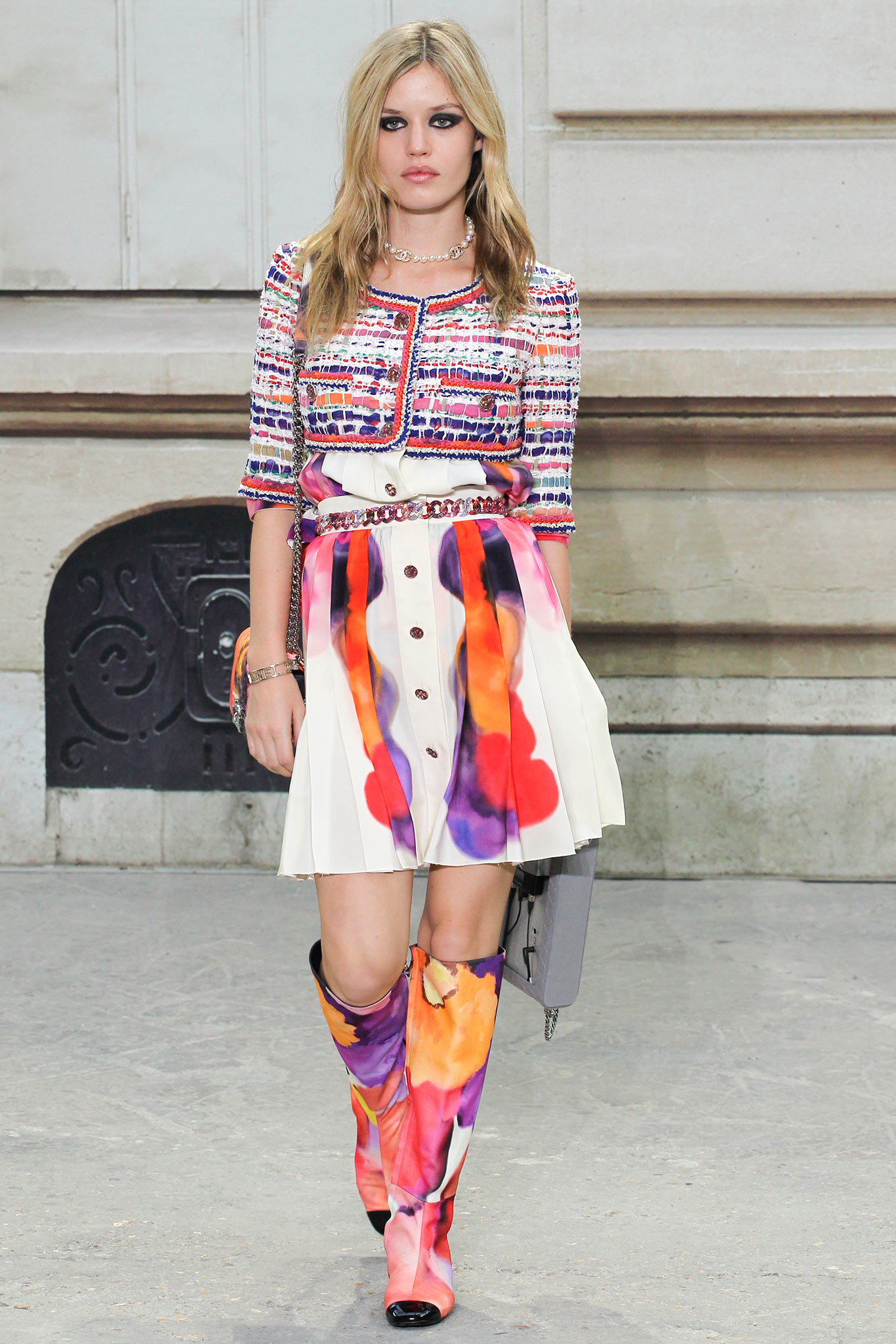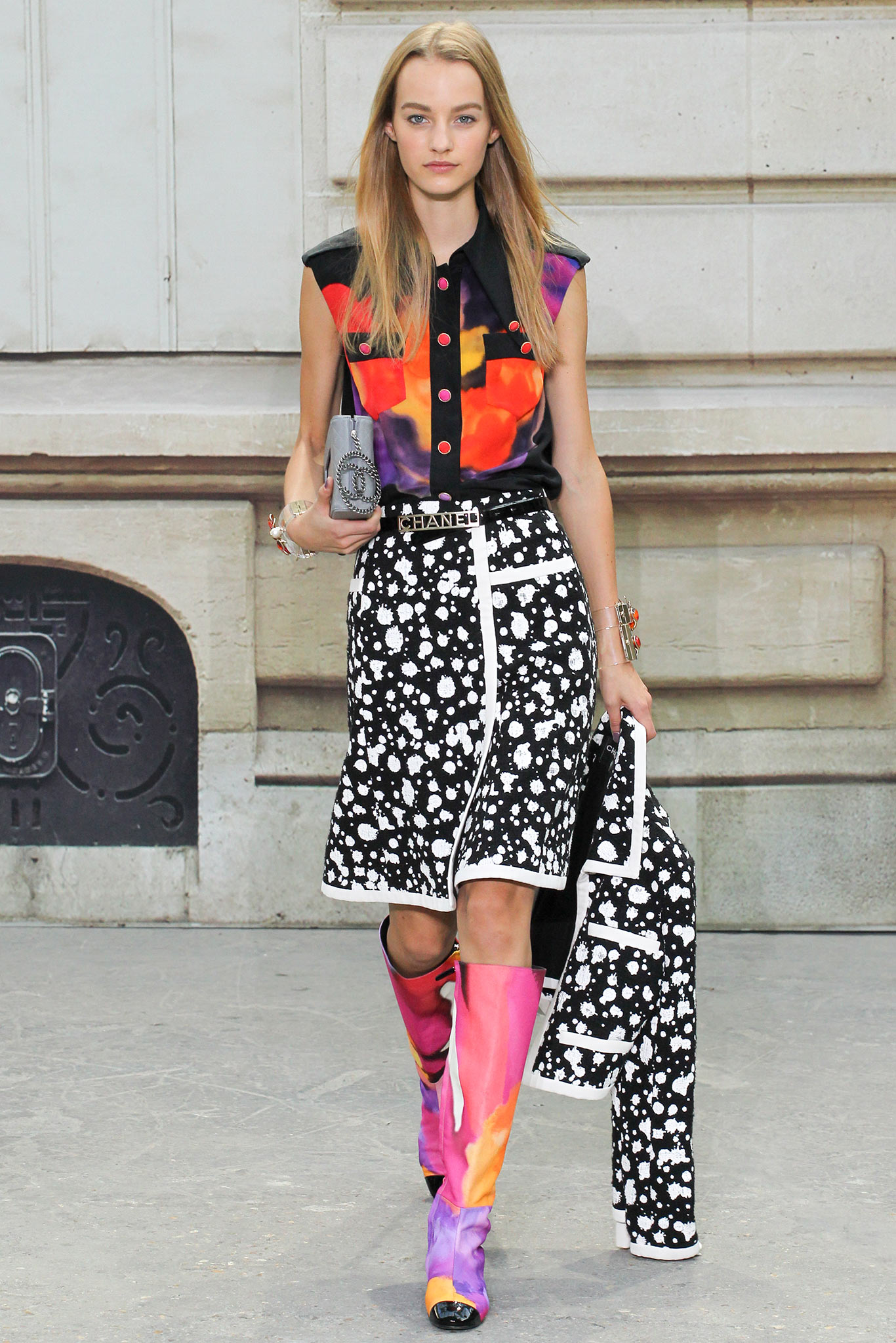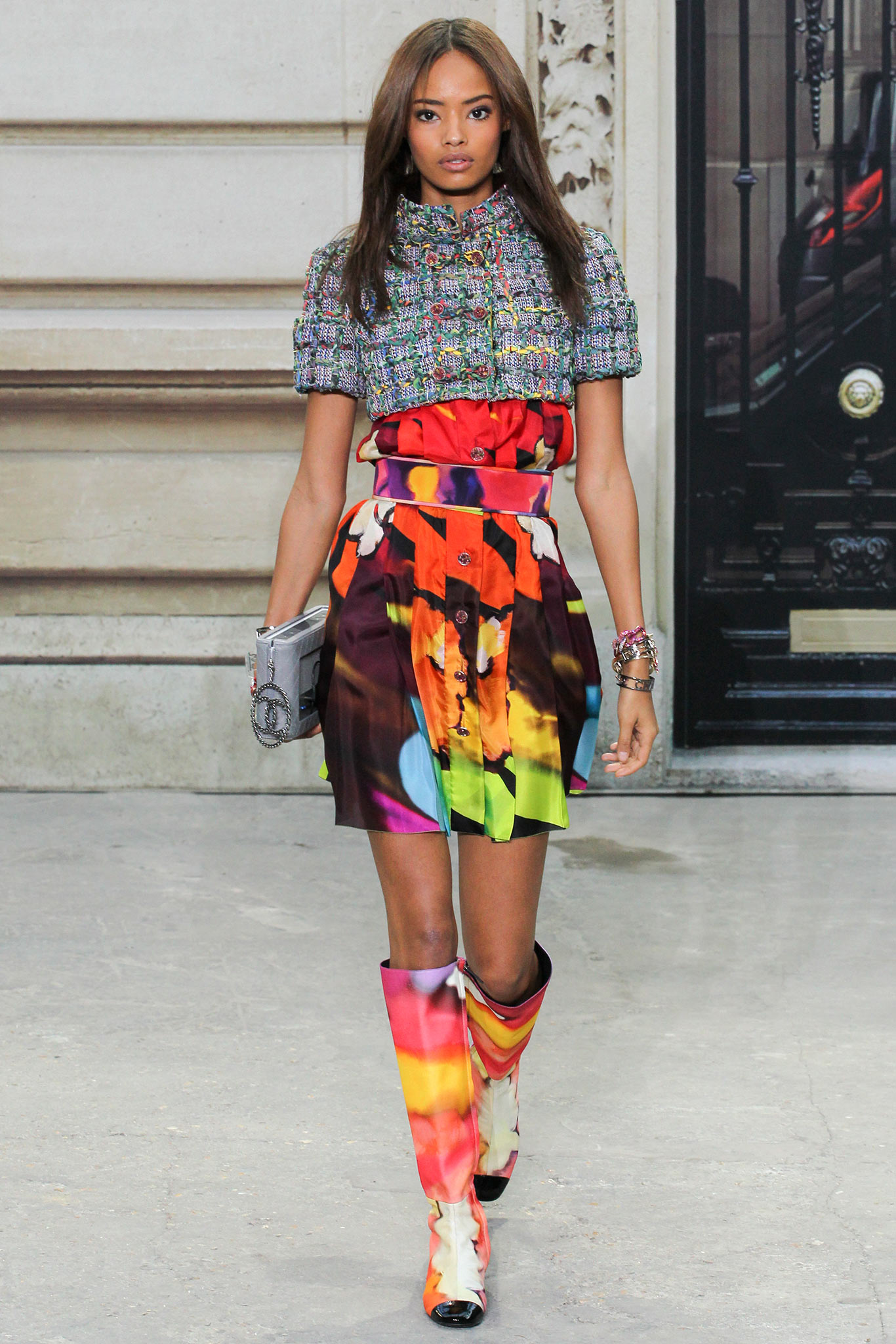 “Be Your Own Stylist” was a theme that was discussed by Lagerfeld in his interviews on this collection and while he set out over 80 models wearing individual looks and while many of were grouped together in various similar looking including tweed suits, bright and colorful rainbow outfits with bold floral rain boots, military monochromatic looks, black/white looks with a touch of metallic golds.